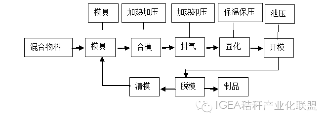 5. 模压成型。完成加工过程,压机自动回程后,从模腔手工取出压坯,压坯冷却至60℃左右进行打孔和修边作业;产品完全冷却后,方可堆成堆垛摆放。