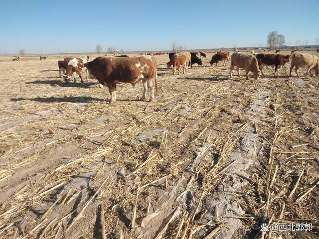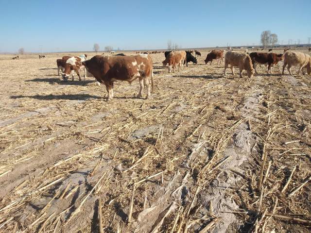 西门塔尔肉牛在地里自由采食玉米秸秆